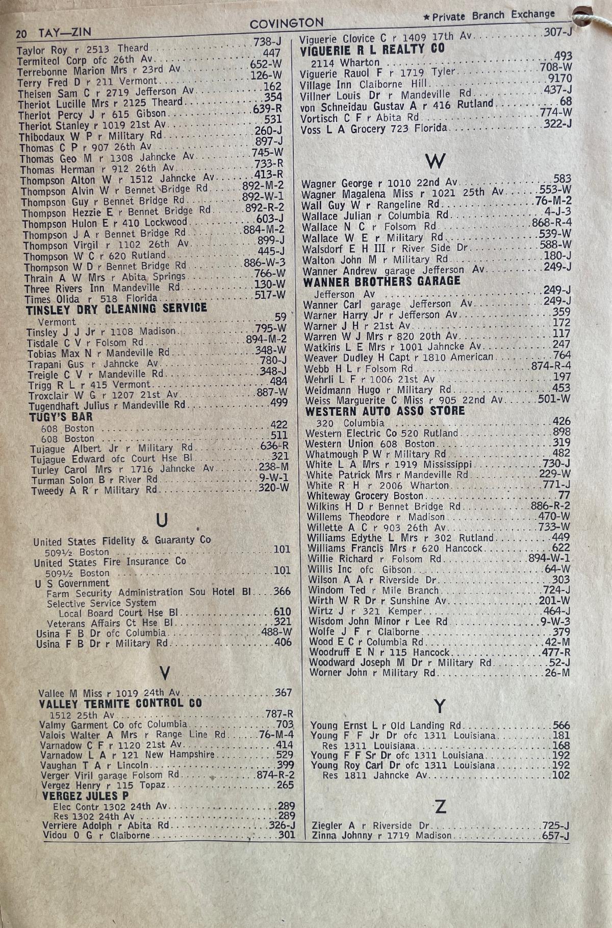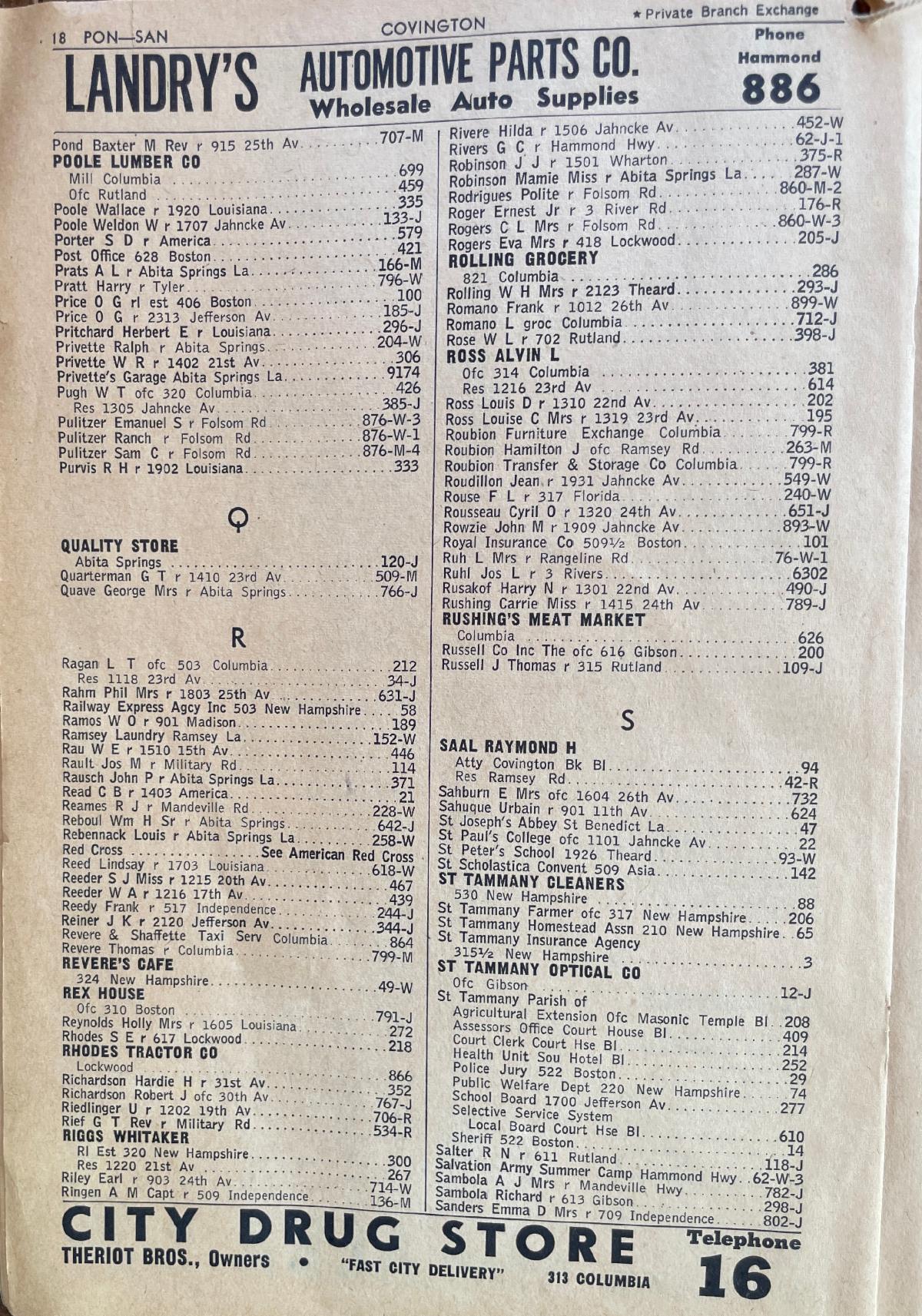 Prior to 1956, the avenue blocks were numbered by how far they were from the Bogue Falaya River. The Ross homes are 13 and 12 blocks from the river. The street-name changes made all addresses west of Jefferson Avenue "West" and all addresses east "East." Hence, the Rosses are now 6 and 5 blocks from Jefferson. Everything north of 21st Ave became "North." Everything south of 21st Avenue became South. The north-south streets are named after the U.S. presidents in chronological order from Washington to Cleveland. Exception: There is only one Adams Street. President Fillmore's street is misspelled as Filmore (one "l" instead of two).