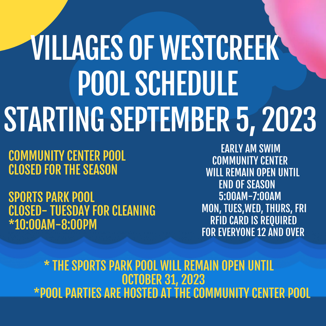 We just wanted to inform you that the pool schedule will change starting on September 5th. As summer comes to an end, we want to make sure everyone is aware of the new schedule. Be sure to keep an eye on the schedule for any updates or changes throughout the season. Stay safe, and have fun! | |