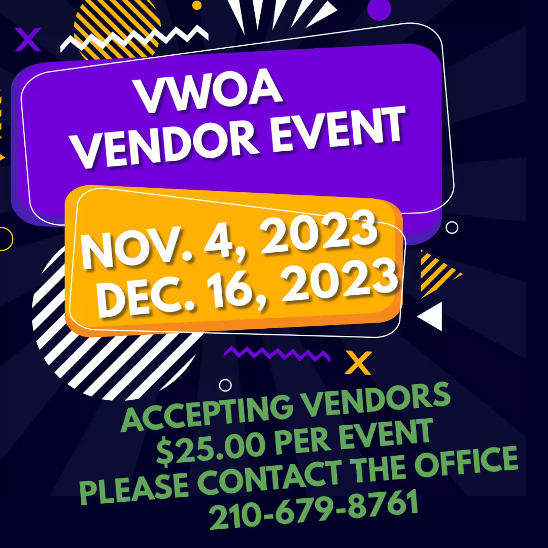 If you wish to add your yard sale to the listing, please call the VWOA Office at 210-679-8761 by 12 noon on Friday before the scheduled yard sale.