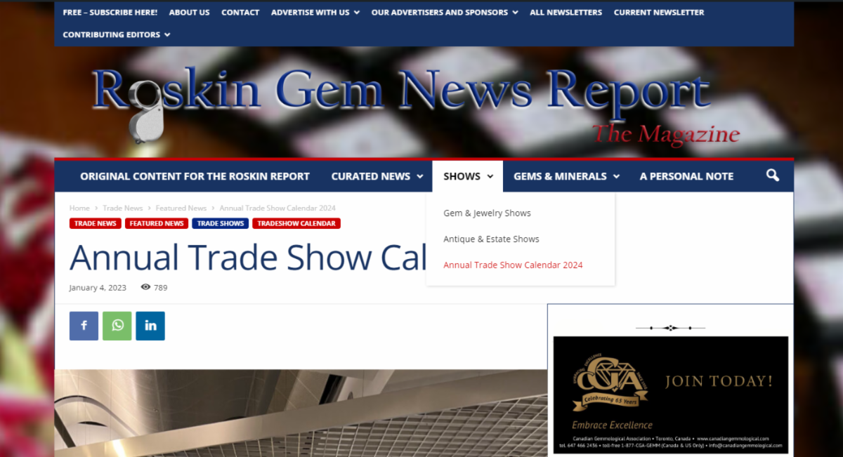 Here's the link, Tap Here, but if you want to go to it often, no need to look for this link. Just go to the online magazine, the Roskin Gem News Report, and look for the SHOWS menu tab. It will look like this...