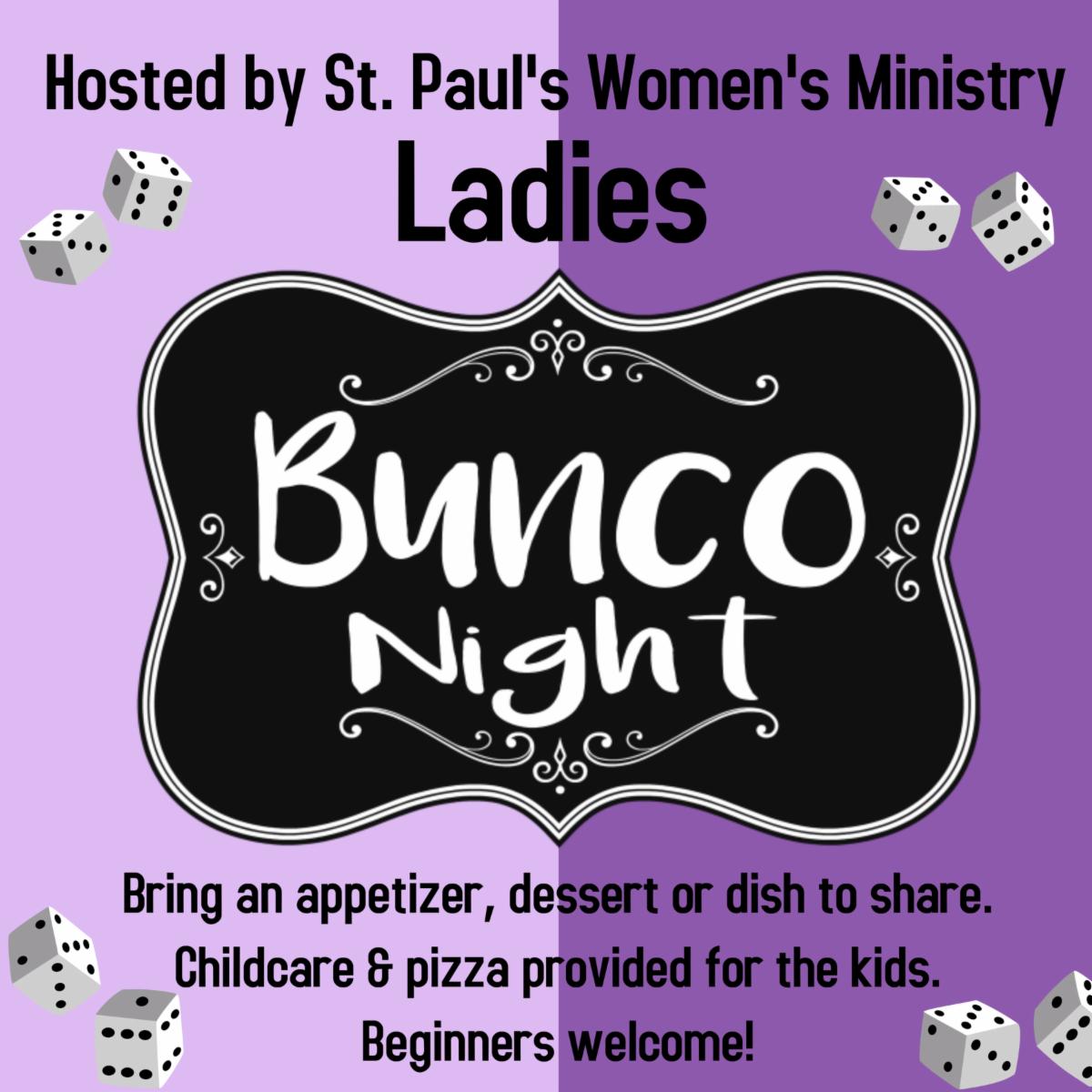 Our next Women's Ministry Bunco Night is Tuesday, April 23. Ladies, come roll the dice and have some fun playing Bunco as we support local and global charities. The fun begins at 5:45pm with dinner and a devotion, followed by Bunco at 6:30pm. There's no cost to attend, but if you feel so compelled, we are collecting monetary donations for our charity of the month. Feel free to wear comfy clothes or even your PJ's. You don't have to be a member of St. Paul's to participate, so invite a friend! Child care and pizza available for younger children.