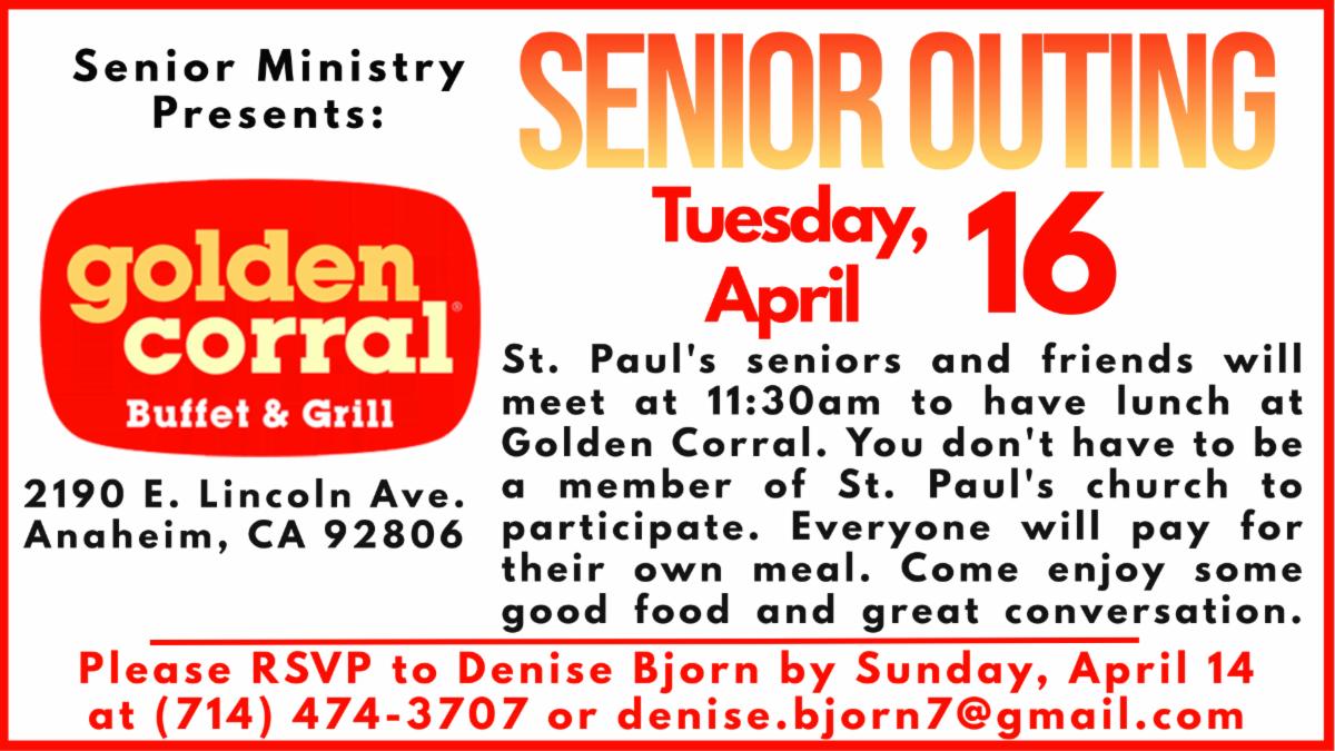 Our next Senior Moments gathering will take place on Tuesday, May 7, at 11:30am in the Fellowship Hall. There will be a special presentation given by the Orange County Office of Aging entitled: "Mind Your Brain: Strategies for Cognitive Strength at Any Age." Come learn and enjoy a FREE meal, followed by hanging out with friends, playing cards, putting together a puzzle, doing crafts, or anything you want to do. All ages are welcome and you do not have to be a St. Paul's member to participate. Please RSVP to Senior Ministry Coordinator Denise Bjorn at denise.bjorn7@gmail.com or call (714) 474-3707.