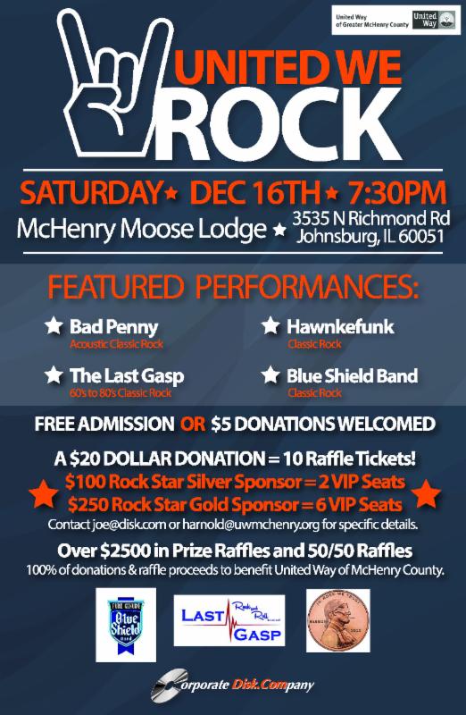 After you spend the day holiday shopping, come out to listen to some great local talent presented by Corporate Disk Company! Free Admission (or $5 suggested donation) with 100% of donations and raffle proceeds to benefit United Way of Greater McHenry County! Enjoy $2500 in Raffle Prizes and a 50/50 Raffle!
