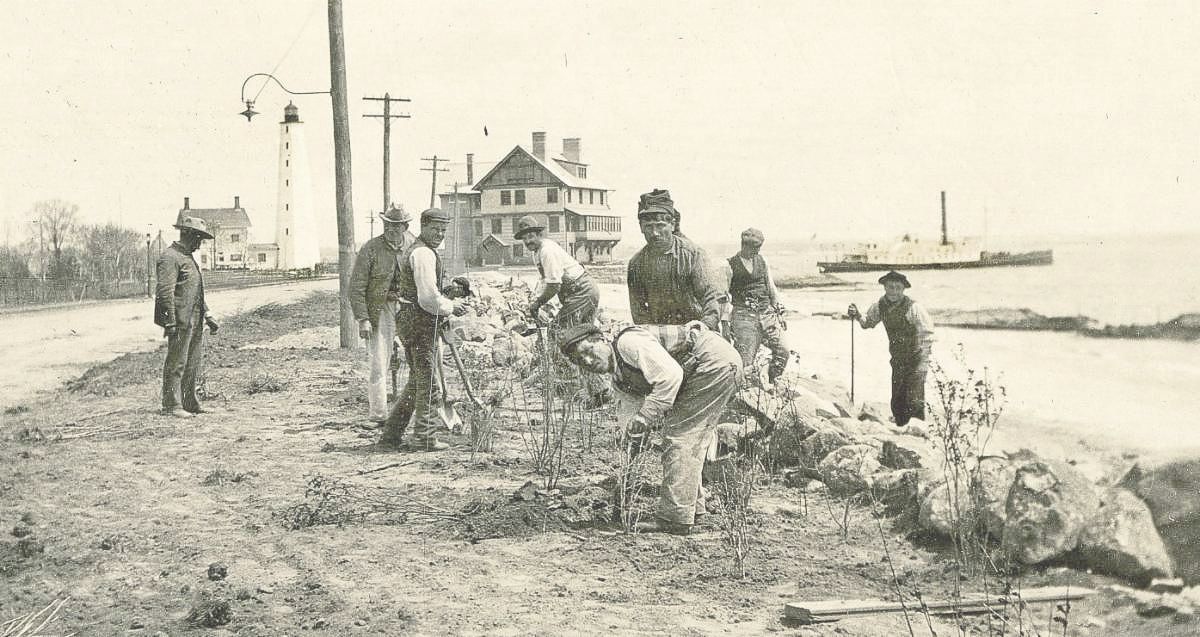 Photo, above: the Olmsted crew from Meadow Court (now the Lighthouse Inn) planting shrubs along Pequot Avenue, ca. 1905. The lighthouse is to the center-left back. Olmsted archives.