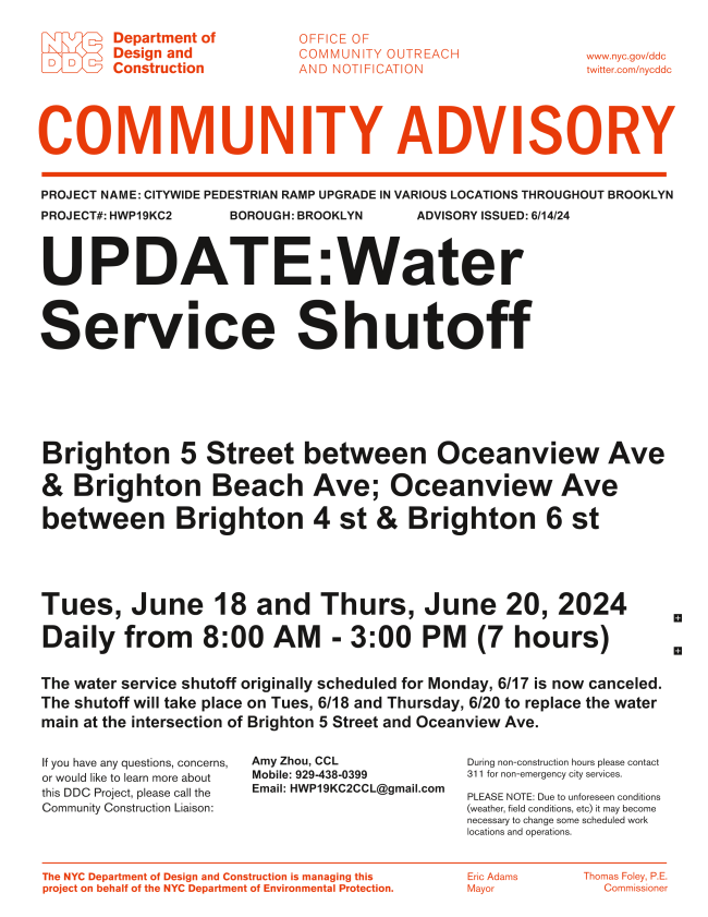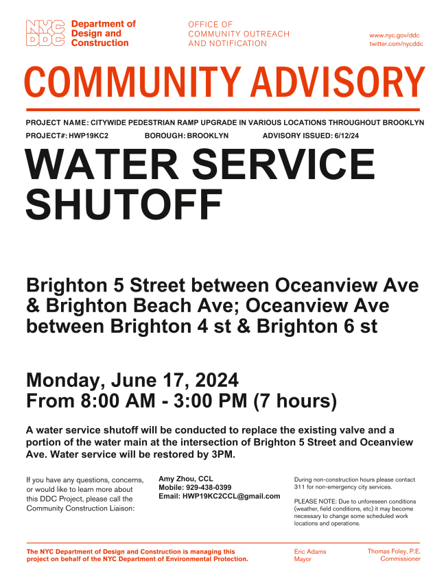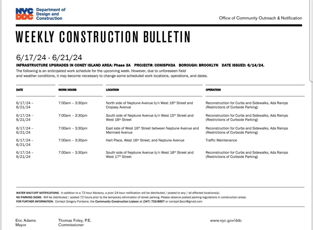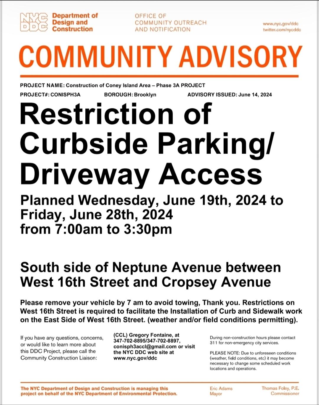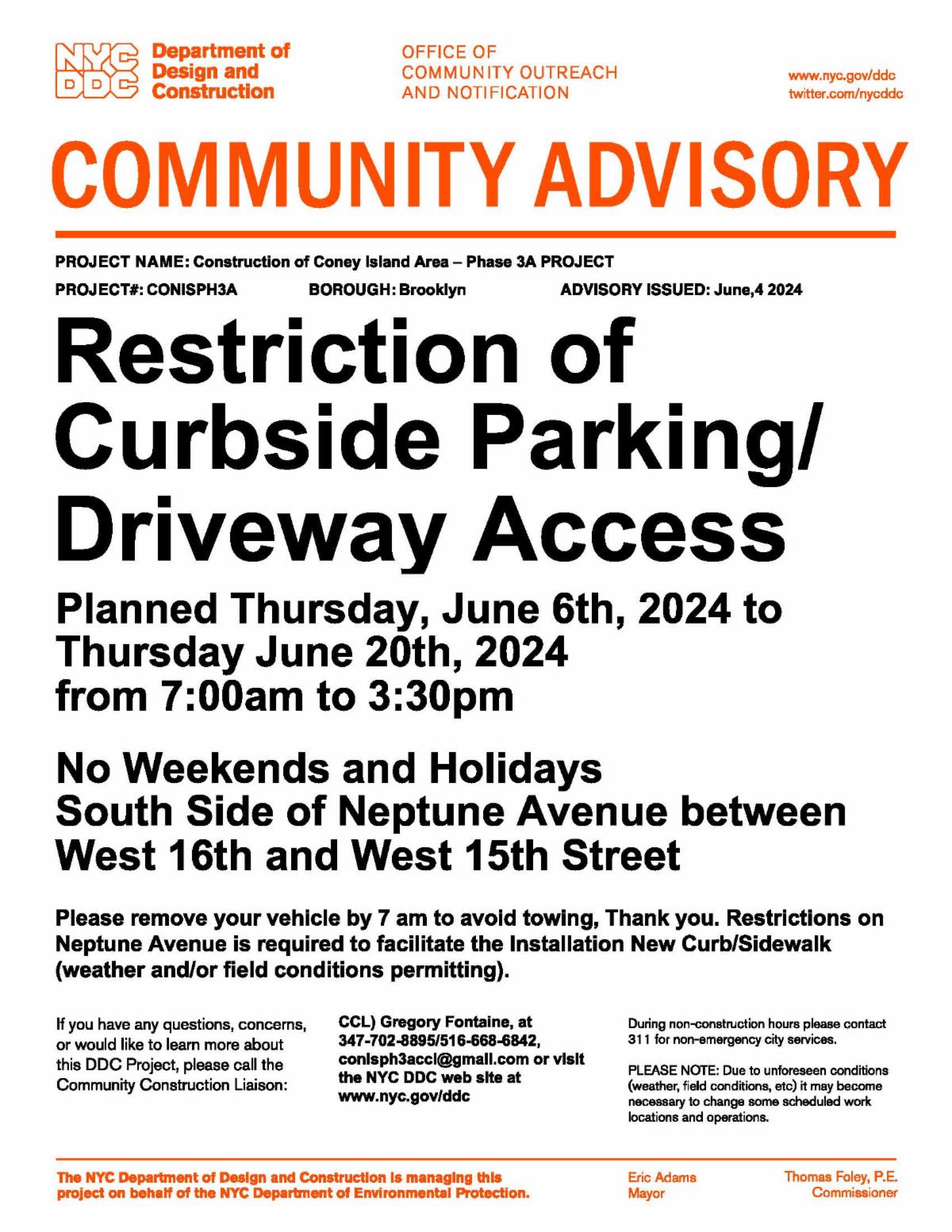 NYCDOT approved flagging and traffic devices will be utilized for the safety of the public. Parking will not be allowed on Brighton Beach Ave, between Brighton 1st Street & Brighton 4th St to allow traffic diversions, and to maintain (1) westbound travel lane. Parking will also be restricted for 150’ ft. along each curb lane at each Crane location to allow the placement of a Crane and materials.