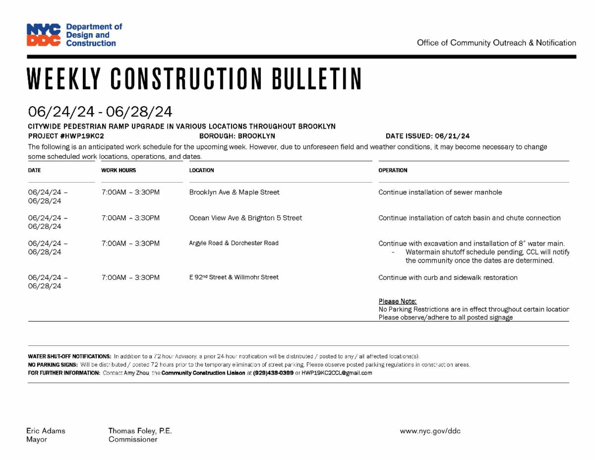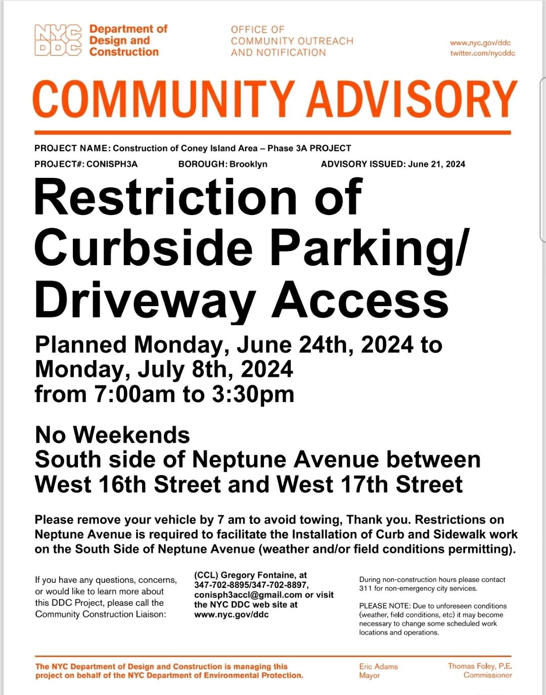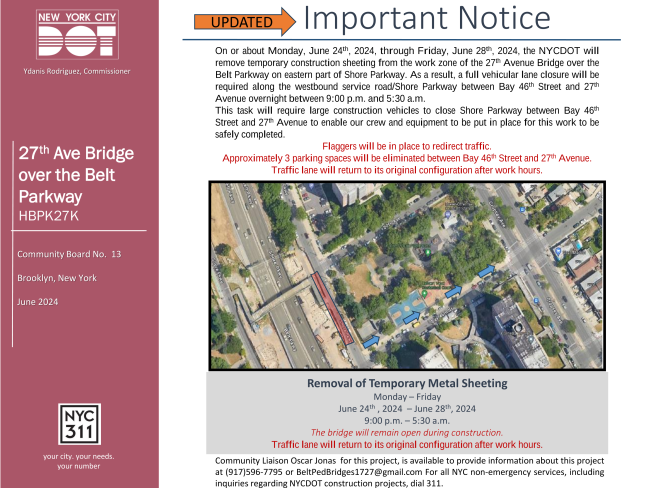 NYCDOT approved flagging and traffic devices will be utilized for the safety of the public. Parking will not be allowed on Stillwell Ave, between Bay 47th & Bay 50th Street to allow traffic diversion, maintaining one (1) travel lane of open in each direction at all times. Parking will also be restricted for 150’ ft. along each curb lane at each Crane location to allow the placement of a crane and materials.