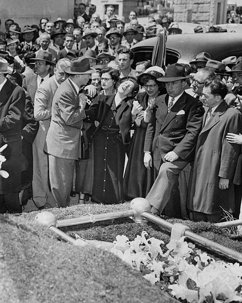 Wife of William Lurye breaks down at his funeral in Queens. She is supported by Charles Zimmerman, ILGWU Vice President, 1949.