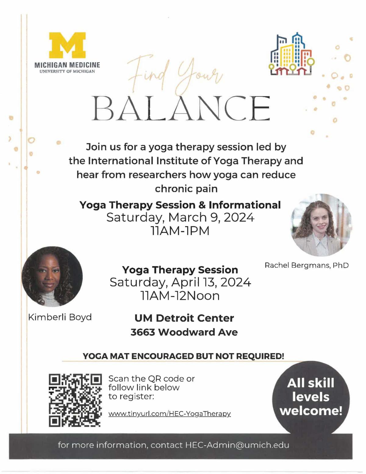 Saturday, April 13th, at the UM Detroit Center on Woodward, a Yoga Therapy Session. The session will run from 11am-12pm. Take a look at the flyer for more information.