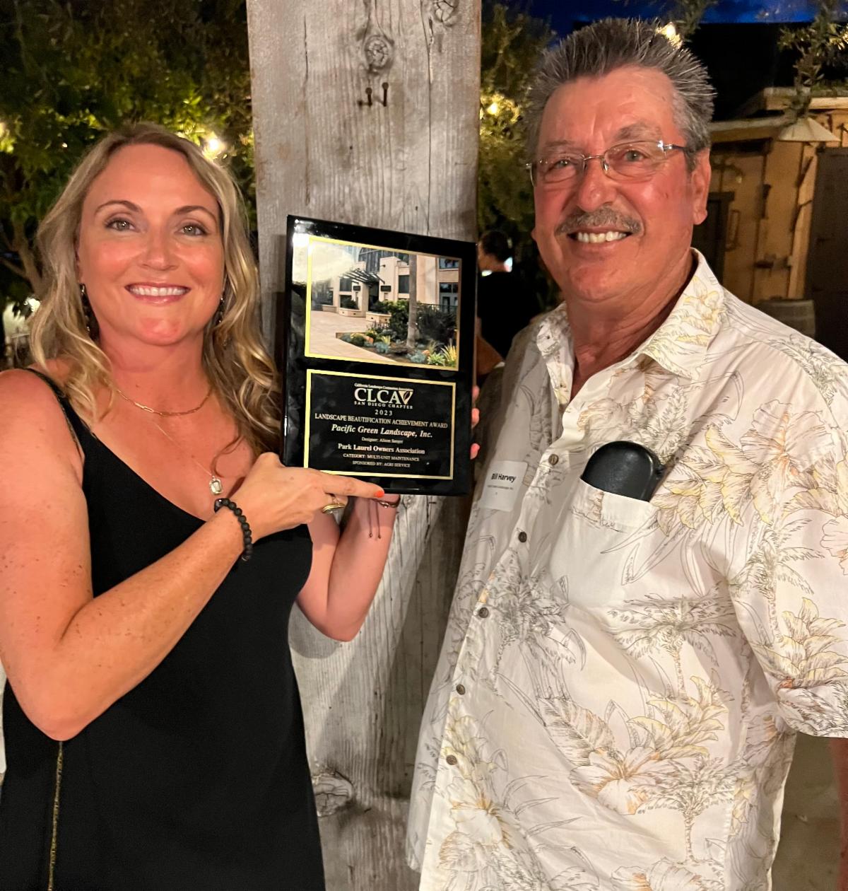 Alison Sanger, Landscape Designer, and Bill Harvey, Senior Account Manager, were recently recognized with a 2023 CLCA Landscape Beautification Award for their exceptional contributions at Park Laurel Owners Association.