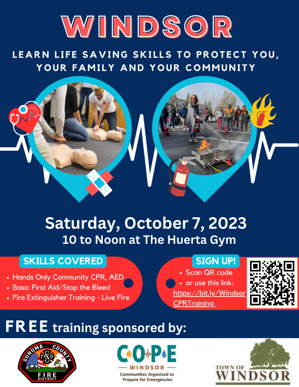 Windsor COPE, Sonoma County Fire District, and the Town of Windsor are sponsoring a free training for Windsor residents on Saturday, October 7, from 10AM to 12PM at Huerta Gym, 9291 Old Redwood Hwy, Suite 200.