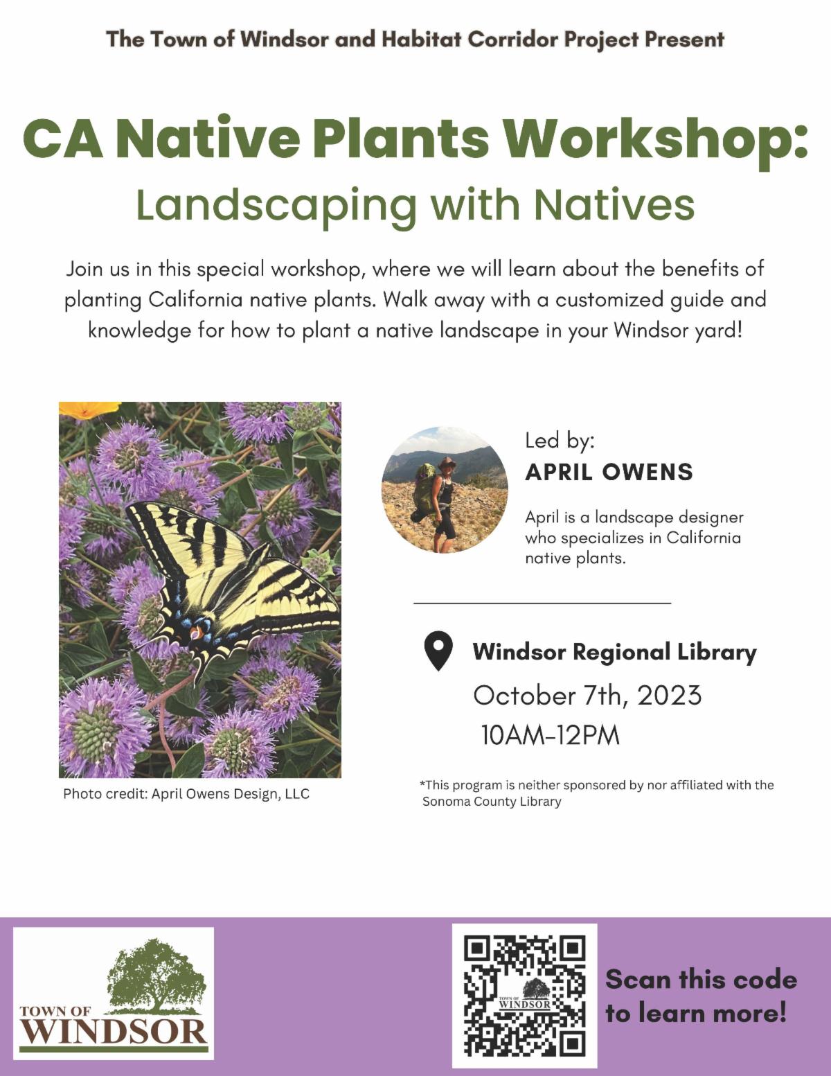 Please join the Town of Windsor and Habitat Corridor Project on October 7, at the Windsor Regional Library at 10AM for a FREE CA native plants workshop, open to all Windsor residents.