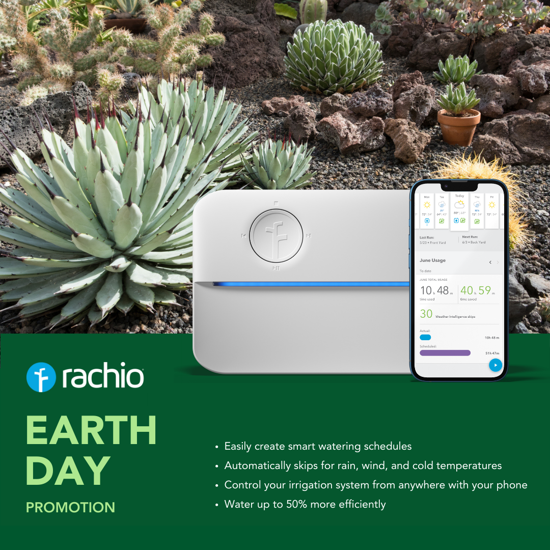Join the water-saving revolution this Earth Day and upgrade to a Rachio 3 Smart Sprinkler Controller. Proven to water up to 50% more efficiently than other sprinklers, Rachio helps you effortlessly save water while ensuring your plants stay healthy!