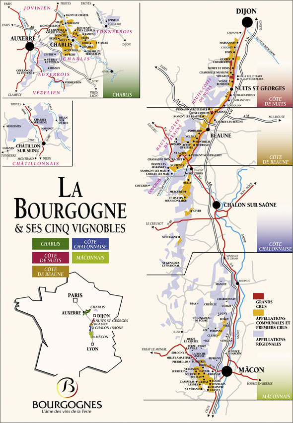 Located in the east-central part of France, Burgundy has 5 primary wine growing areas: