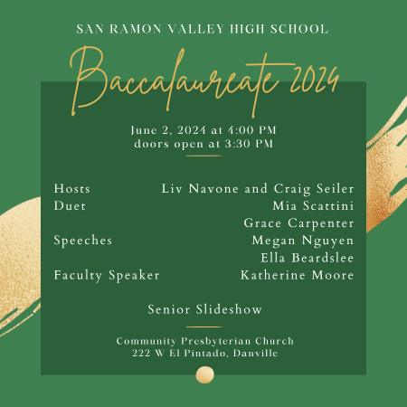 SRV Baccalaureate is an optional, inspirational service that will last about one hour at Community Presbyterian Church (CPC). Graduates, please wear graduation gowns, but no cords, or caps.
