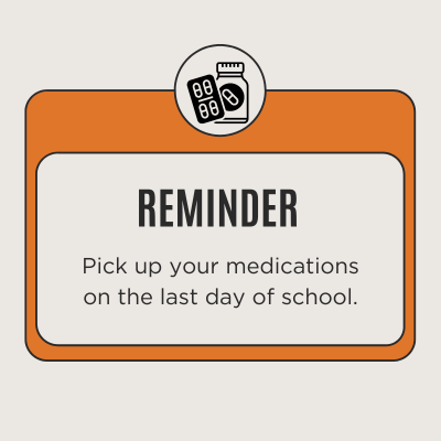 Please remind your student to pick up medications from the nurse’s office by or on the last day of school, June 5th. School staff will discard any unclaimed medications. If you have a student attending summer school, please see this note here as you will need to update medication forms.