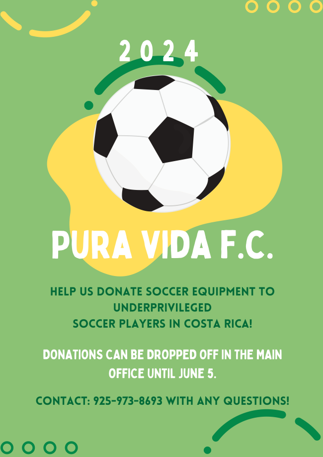 Have old soccer equipment or uniforms?! We are currently collecting soccer equipment for underprivileged students in Costa Rica, in the Main Office. Please bring any soccer items you have to our bin in the front office-it will have a new purpose!