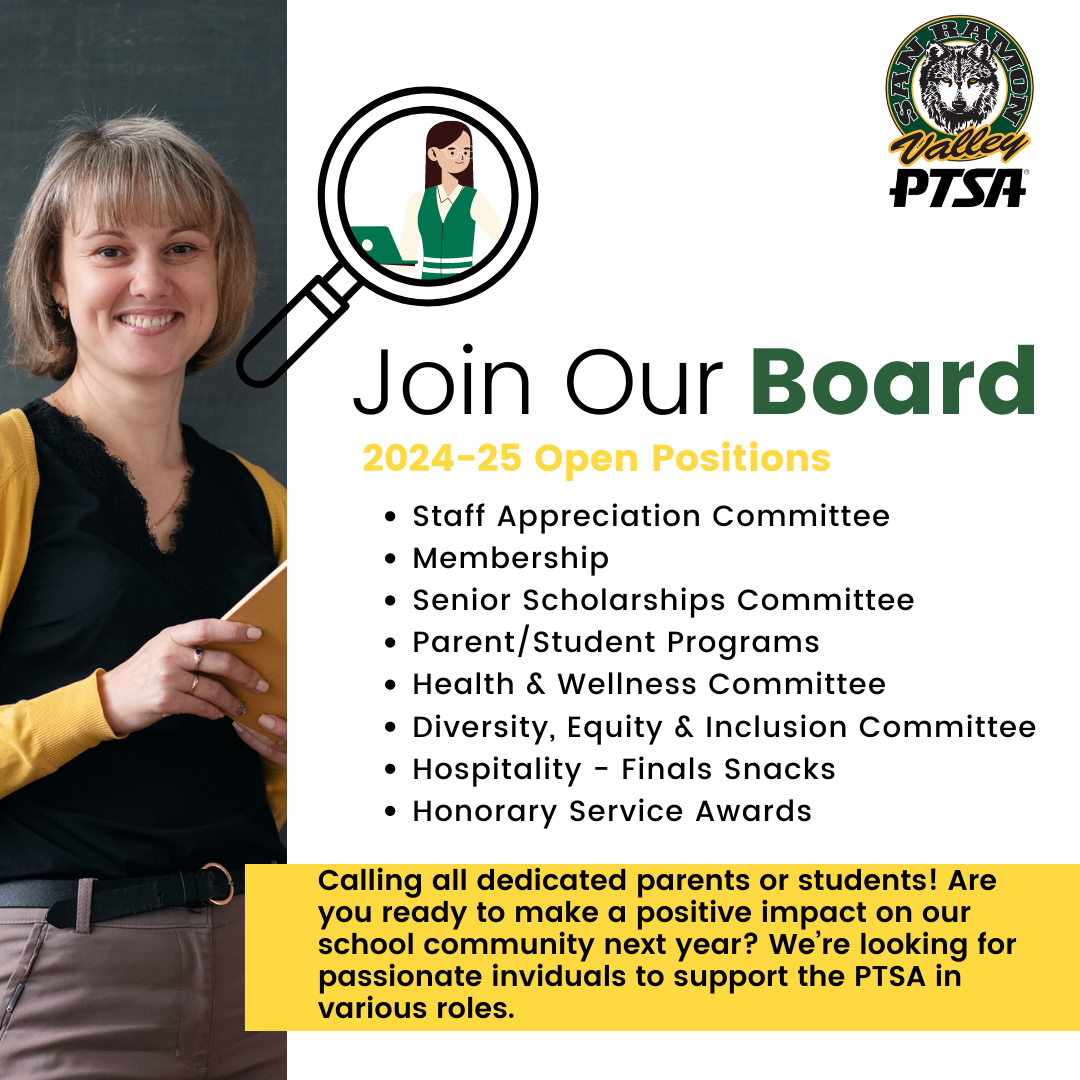 Calling all SRVHS parents & students! We have exciting PTSA committee openings (can also be filled by students!):