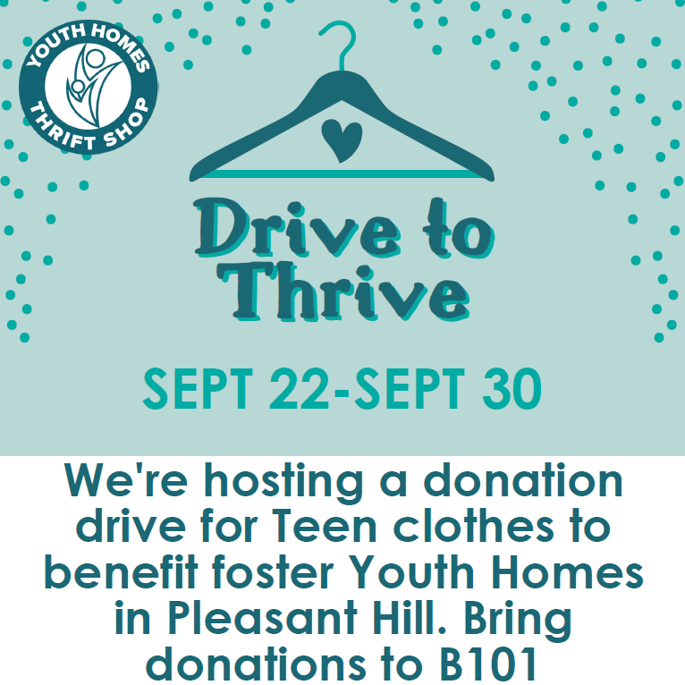 SRV Clothing drive for Drive to Thrive starts September 22 and ends September 30th. Please drop items in B 101. There is a big need for Teen clothes to benefit foster Youth Homes in Pleasant Hill.