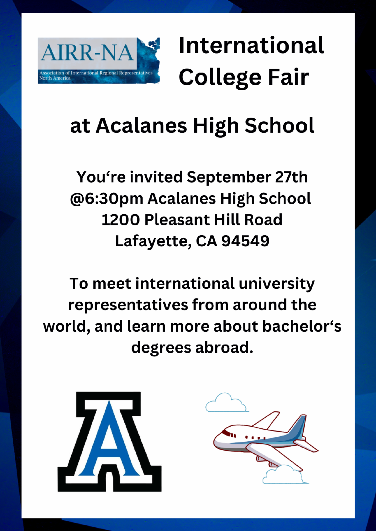 Acalanes High School invites interested SRVHS students to its International College Fair! Learn about colleges and degrees from around the world.