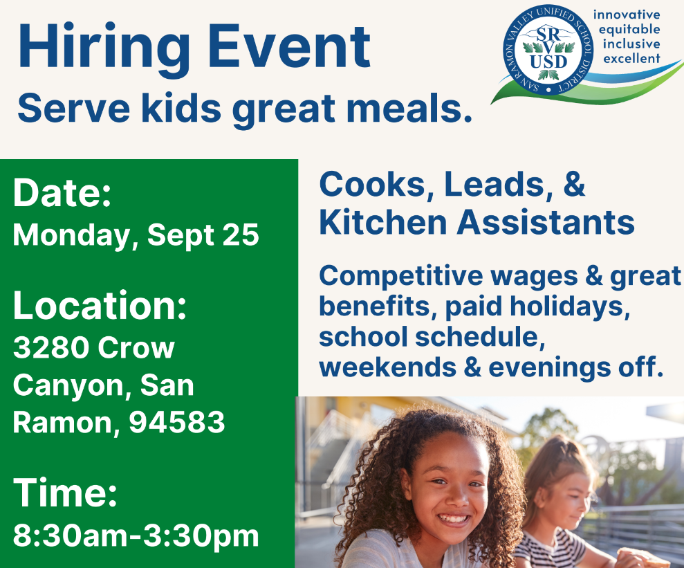 - 8:30AM-3:30PM, SRVUSD Child Nutrition Services Hiring Event, District Office
