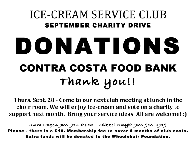 Thursday, Sept. 28 - Come to our next club meeting at lunch in the choir room. We will enjoy ice cream and vote on a charity to support next month. Bring your service ideas. All are welcome! :)