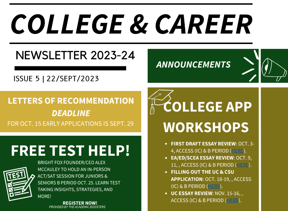 Check out this week's College & Career Newsletter to keep up to date on all things from the College & Career, including Sept. 29 deadline to ask for letter of rec for Oct. 15 Early application, District College fair, international college fair, FREE test help Oct. 25, workshop sign-up links during Access and B periods