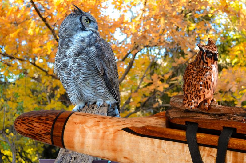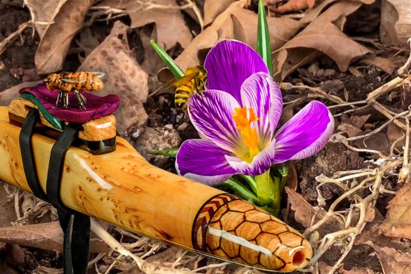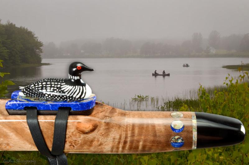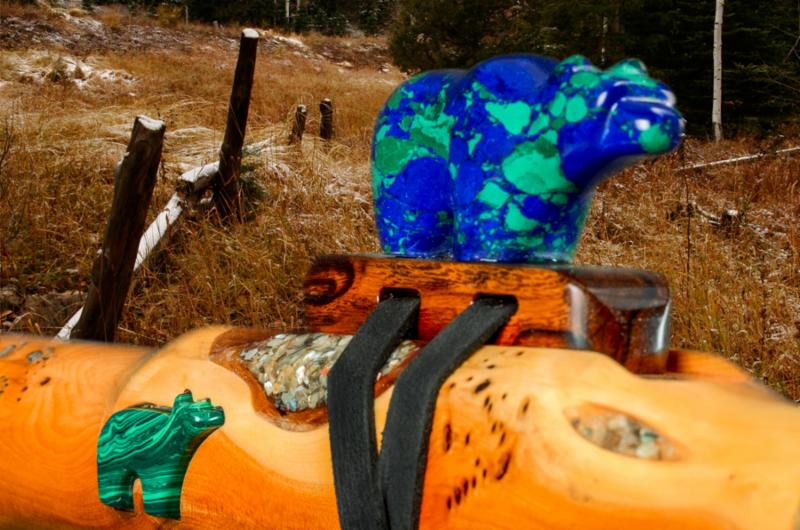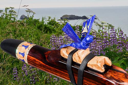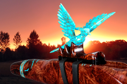 Soaring is made from Desert Ironwood with Box Elder Burl, Yellow Cedar Burl, and Abalone as trim. The mouth piece of Box Elder Burl is followed by an Abalone Inlay ring. the Abalone represents air or space. The Yellow Cedar Burl inlay represents the Sun.