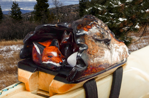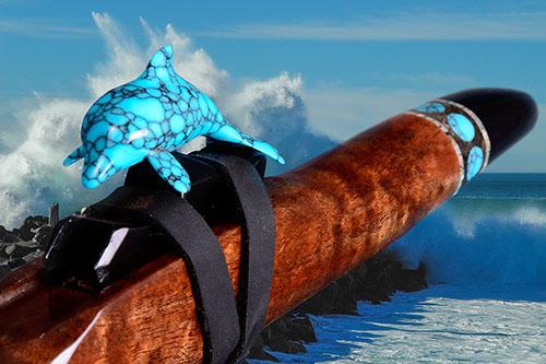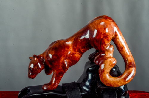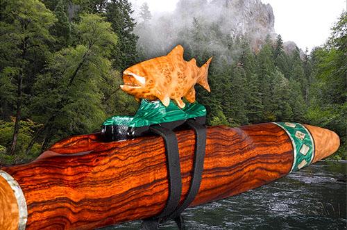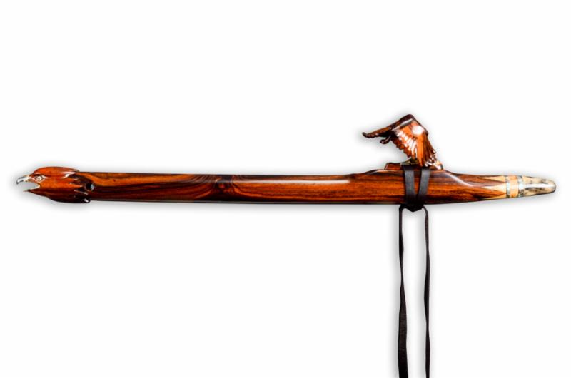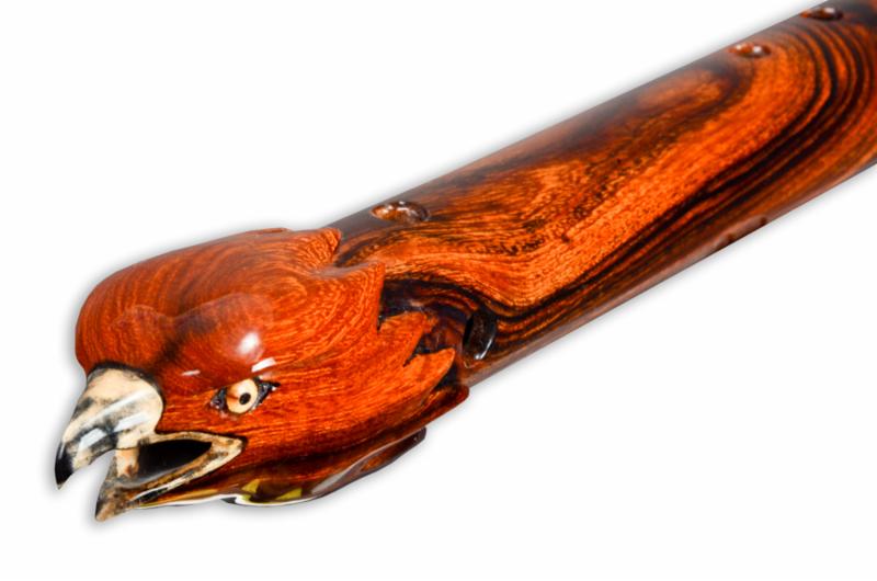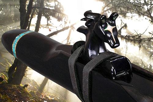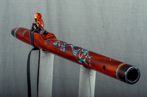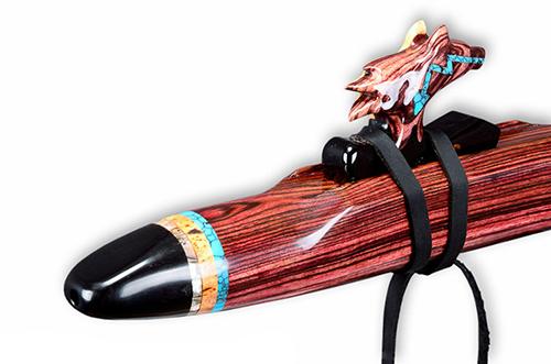 Prowler is made from a naturally rich red/orange wood called Padauk. The elegance of the instrument is balanced by the Ebony mouth piece and end cap along with the beautiful solid turquoise ring inlays. The hand carved Panther totem is Red Mallee Burl mounted to Ebony.