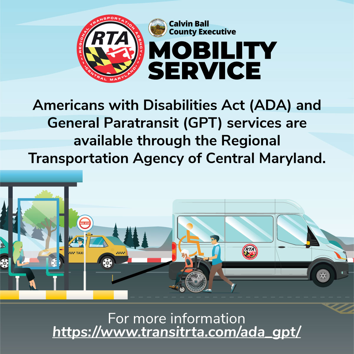 Our paratransit services provide a critical transportation link that result in thousands of rides per month in Howard County and our neighboring jurisdictions. To learn more about our paratransit services and how to sign up to ride, please visit: https://www.transitrta.com/ada_gpt/ or email RTAMobilityServices@transitRTA.com.