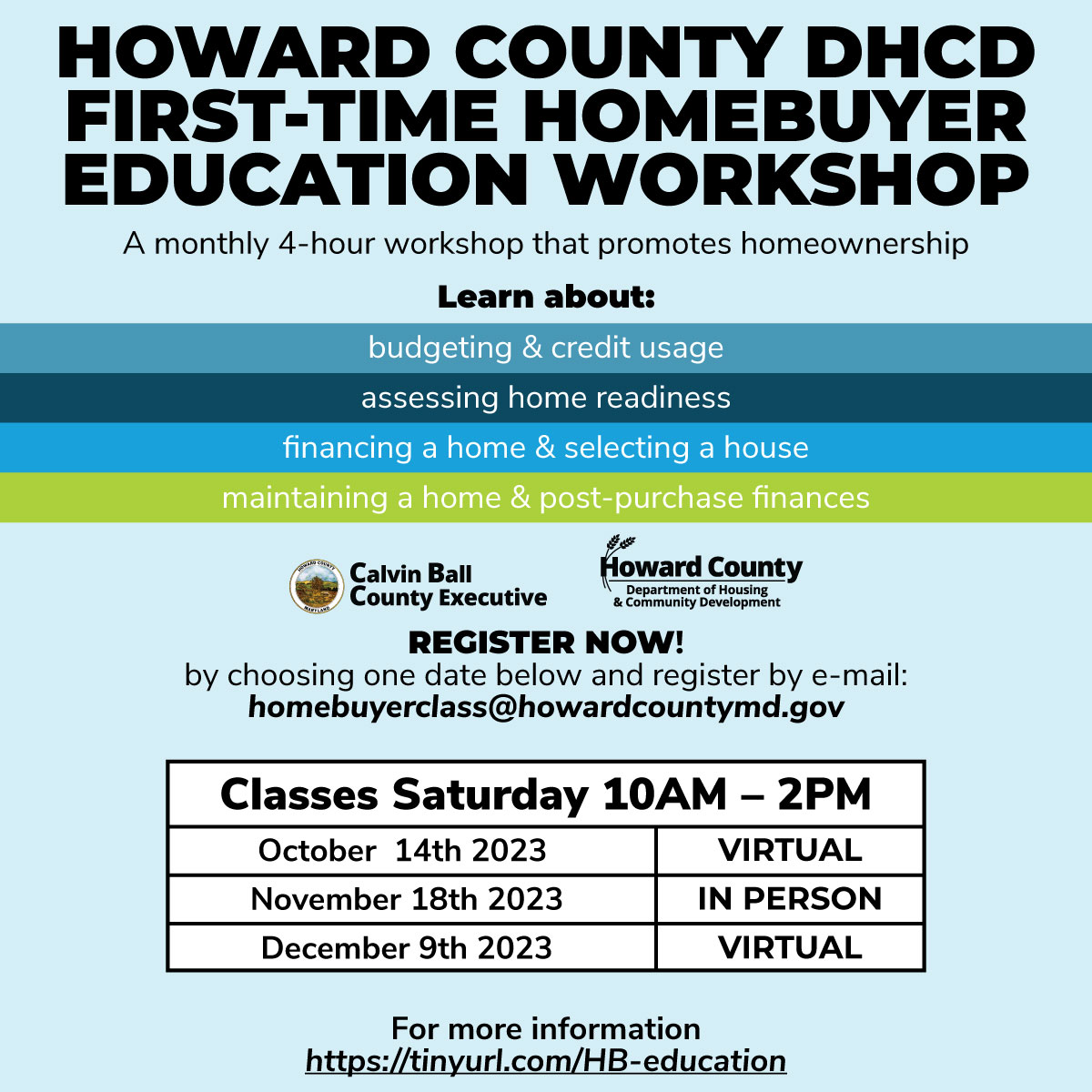 Classes include one 4-hour group workshop, as well as two hours of one-on-one counseling with a HUD-approved credit counselor. Registration is required to participate in these classes. To learn more and sign up, please visit www.howardcountymd.gov/housing-community-development/homebuyer-education.