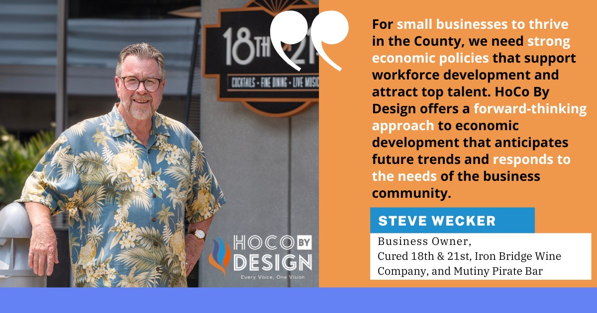 Steve Wecker, owner of Cured 18th & 21st, Iron Bridge Wine Company and Mutiny Pirate Bar, believes HoCo By Design, “offers a forward-thinking approach to economic development that anticipates future trends.”