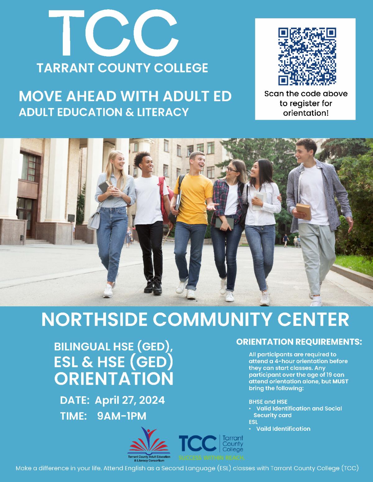 We are happy to share that Tarrant County College as part of the Tarrant County Adult Education and Literacy Consortium is hosting ESL and GED classes at the Northside Community Center. These classes are no cost for those that qualify. Attend our upcoming orientation to learn more about this program.