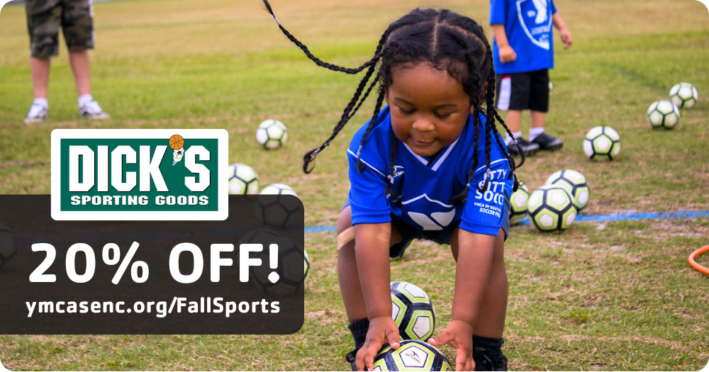 It's time to gear up for fall sports, and we've teamed up with Dick's Sporting Goods to give you a great deal! Friday, August 16 - Sunday, August 18, visit Dick's Sporting Goods stores in Wilmington to receive 20% off your entire order. Whether it's cleats for the kids, back-to-school clothes, or new workout equipment for you, we've got you covered! Use the button below or head to ymcasenc.org/FallSports for your coupon.