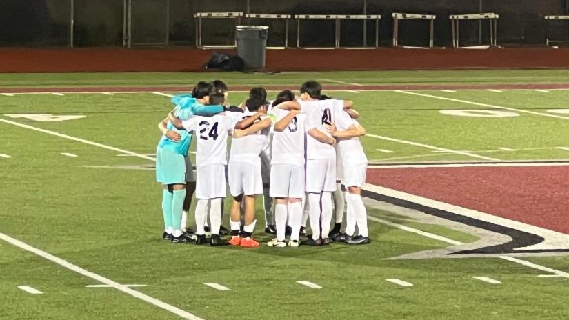 The varsity boys soccer team huddles right before the first overtime period against #1 Hillgrove last Wednesday night.