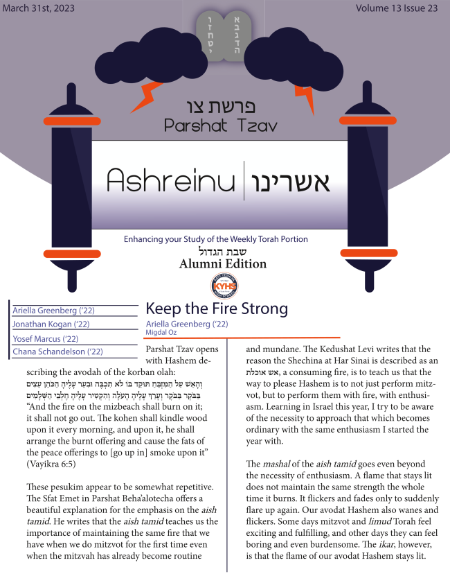 A: When I started my journey as a student in KYHS, I was encouraged by Dr. Wolf to assist in setting up a Nusach Ari-Chabad minyan. Since then, both my davening and my mindset have improved. I enjoy being part of a minyan where the people around me are saying the same words and are saying them with passion.