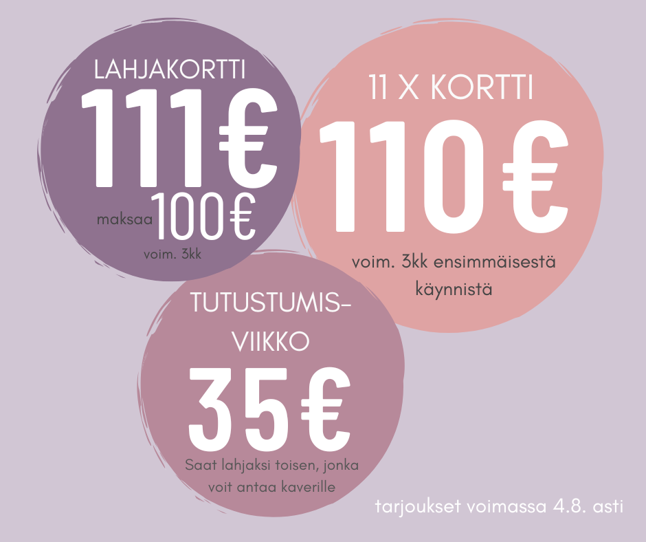Erikoislahjakortti 111 €, hintaan 100 €, voimassa 3 kk