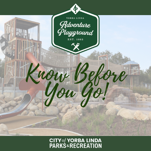 Visit the City of Yorba Linda's website at yorbalindaca.gov for the most accurate, up-to-date information about the newly renovated Adventure Playground.
