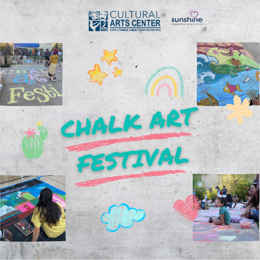 Join us for the second annual Chalk Art Festival at the Yorba Linda Cultural Arts Center. The outdoor paseo will be transformed with artwork provided by professional chalk artists James Festini, Nuria Martinez, Stacy Moffatt, and Lauren Ramirez while attendees enjoy music by Mari. The event will feature a giant chalk mural and plenty of chalk for kids to color, a craft station, and lawn games. Food trucks Bred's Nashville Hot Chicken and Scooter's Italian Ice will be selling food. For more information, please contact the Cultural Arts Center at (657) 242-4660.