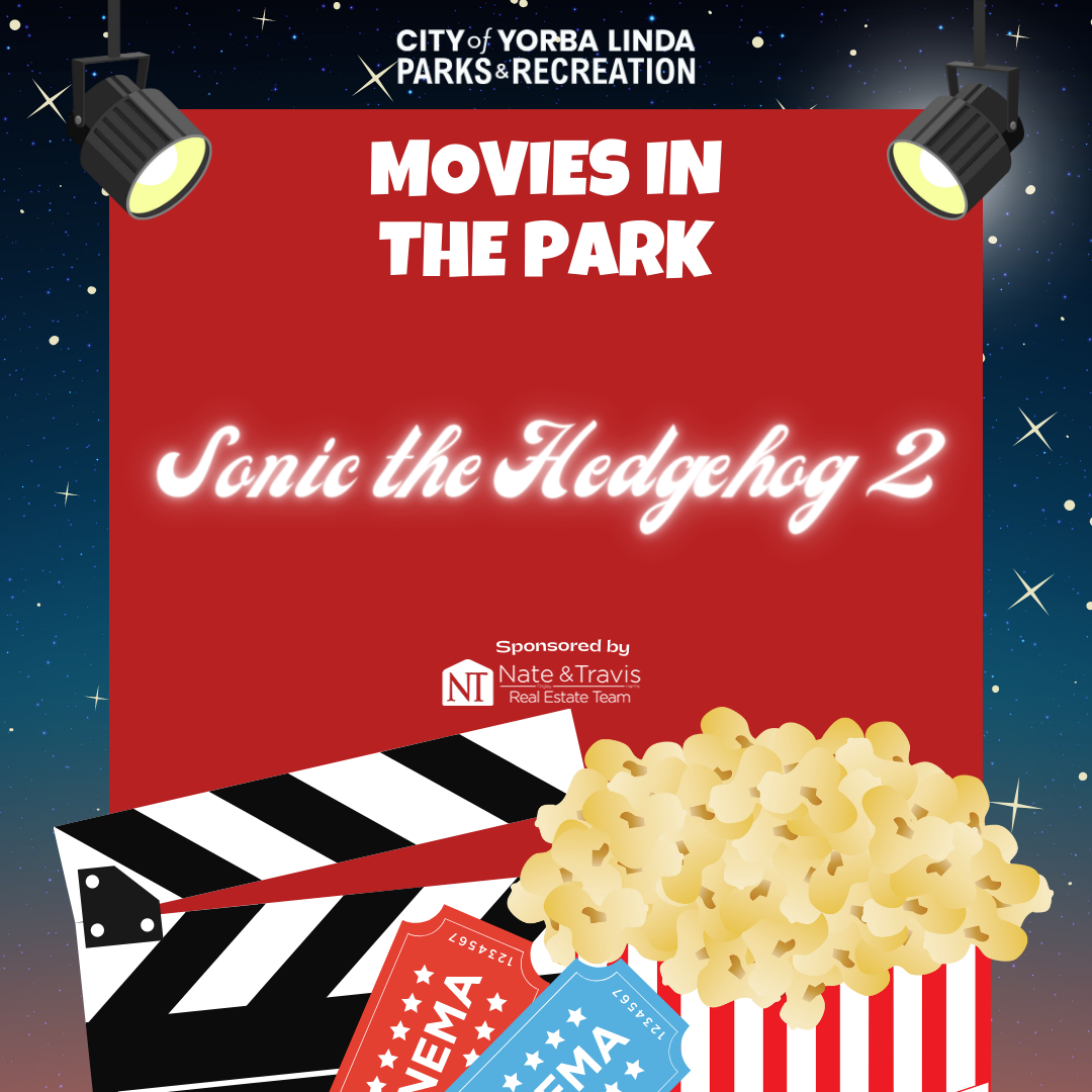 | The City of Yorba Linda Parks and Recreation Department presents Movies in the Park! Come join us at Hurless Barton Park (4601 Casa Loma Ave.) for our third Movie in the Park of 2023 featuring Sonic the Hedgehog 2. The movie will begin at dusk (approx. 8:00 p.m.) and be shown on a 20-foot inflatable screen for an AWESOME viewing experience! Don't forget to bring a blanket or a low lawn chair for seating. Dogs are not recommended. No pre-registration is required. For more information, please call (714) 961-7192. | |