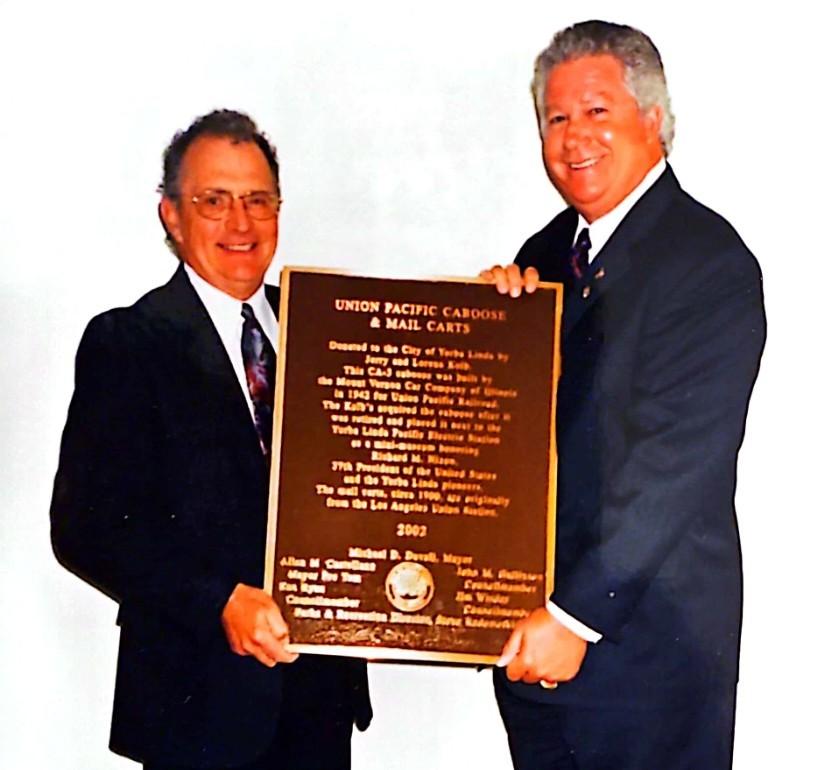 In 2002, the fully restored caboose, which housed the first Richard Nixon Museum, was gifted to the City and the people of Yorba Linda. Included in the gift were the 1880's mail carts that now sit beside the caboose. The City agreed to maintain both and mount the plaque next to the caboose. Neither happened.