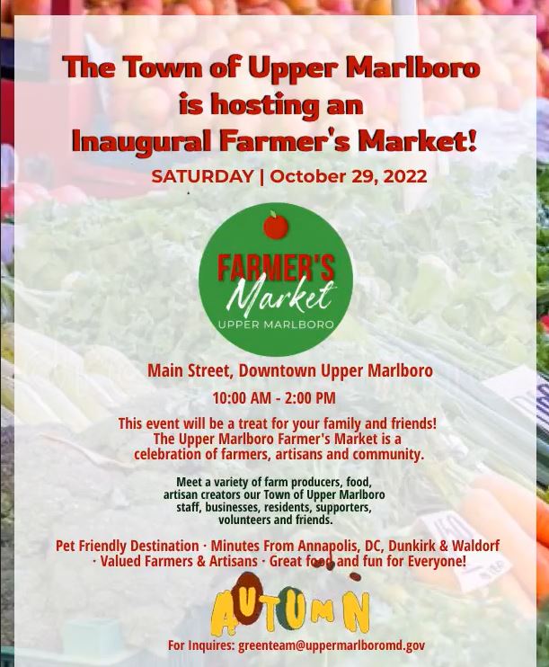 The Inaugural Downtown Upper Marlboro Farmer's Market is being hosted on Saturday, October 29, 2022, from 10 am to 2pm in downtown Upper Marlboro! Please join us for a fun outing with delicious food, healthy farm fresh produce and products, artisan crafts, and more!