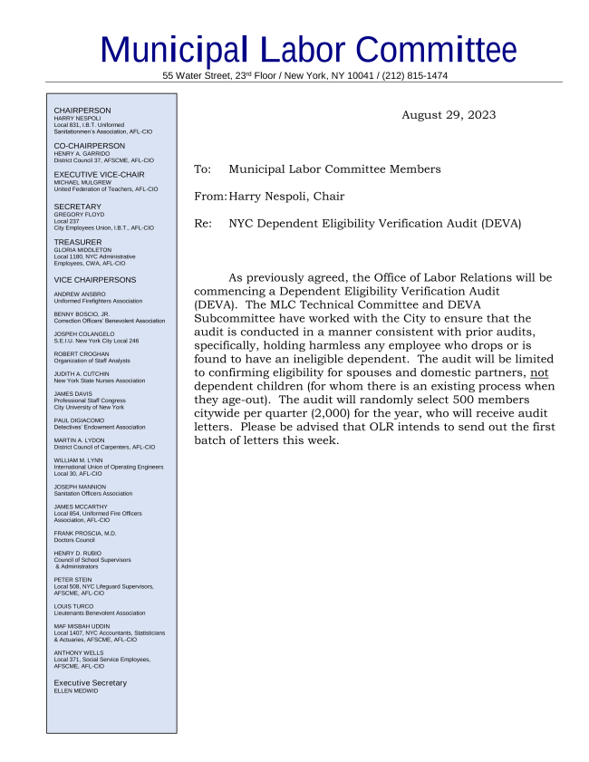 As previously agreed, the Office of Labor Relations will be commencing a Dependent Eligibility Verification Audit (DEVA). The MLC Technical Committee and DEVA Subcommittee have worked with the City to ensure that the audit is conducted in a manner consistent with prior audits, specifically, holding harmless any employee who drops or is found to have an ineligible dependent. The audit will be limited to confirming eligibility for spouses and domestic partners, not dependent children (for whom there is an existing process when they age-out). The audit will randomly select 500 members citywide per quarter (2,000) for the year, who will receive audit letters. Please be advised that OLR intends to send out the first batch of letters this week.