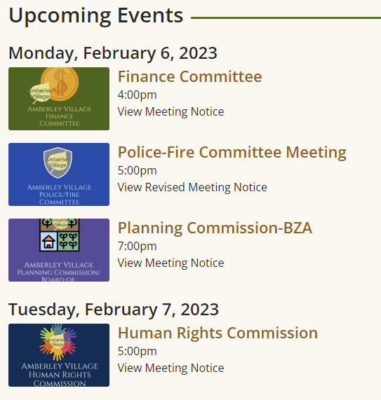 Amberley Village Council meets on the second Monday of each month (unless there is a conflict). The next meeting is scheduled for Monday, February 13, 2023 at 6:30 pm in Council Chambers at the Municipal Building, located at 7149 Ridge Road.