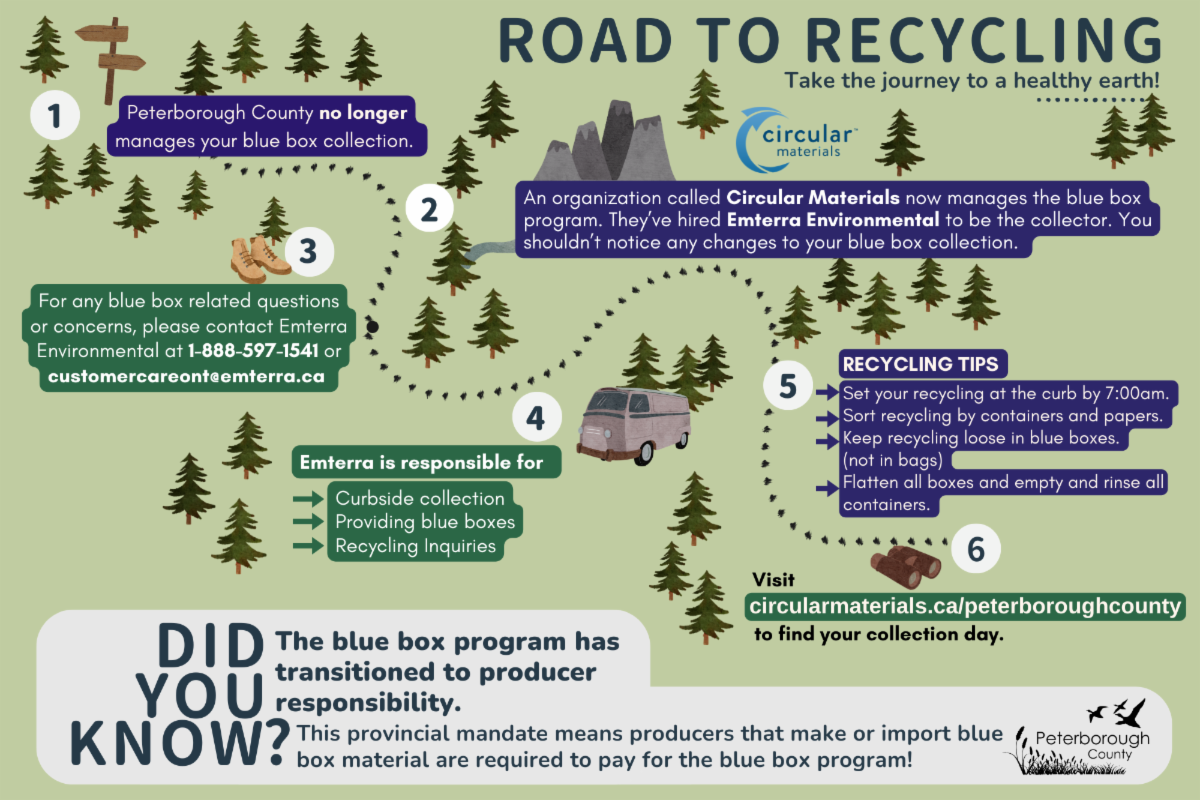 As Ontario moves to producer responsibility for recycling, an organization called Circular Materials now manages the blue box programs and they have hired Emterra Environmental as the collector, however North Kawartha residents should not notice any changes to your curbside recycling blue box collection. Emterra Environmental is responsible for curbside recycling collection, providing residents with new blue boxes, and all recycling inquiries, including missed curbside collection.