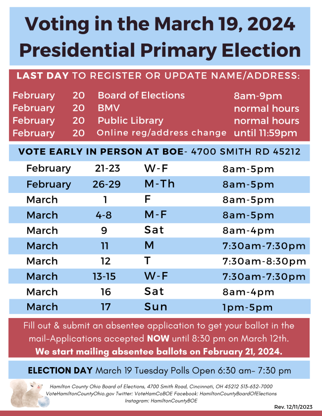 Don't miss your opportunities to be heard! Be sure you're registered for the 2024 Presidential Elections according to the following schedule from the Hamilton County Board of Elections. You can check their website to see if your information is up to date, view a sample ballot or locate your polling place. Please note that elections in Hamilton County are overseen by the Board of Elections, and that questions should be directed to them at the link below, or by calling (513) 632-7000. | |