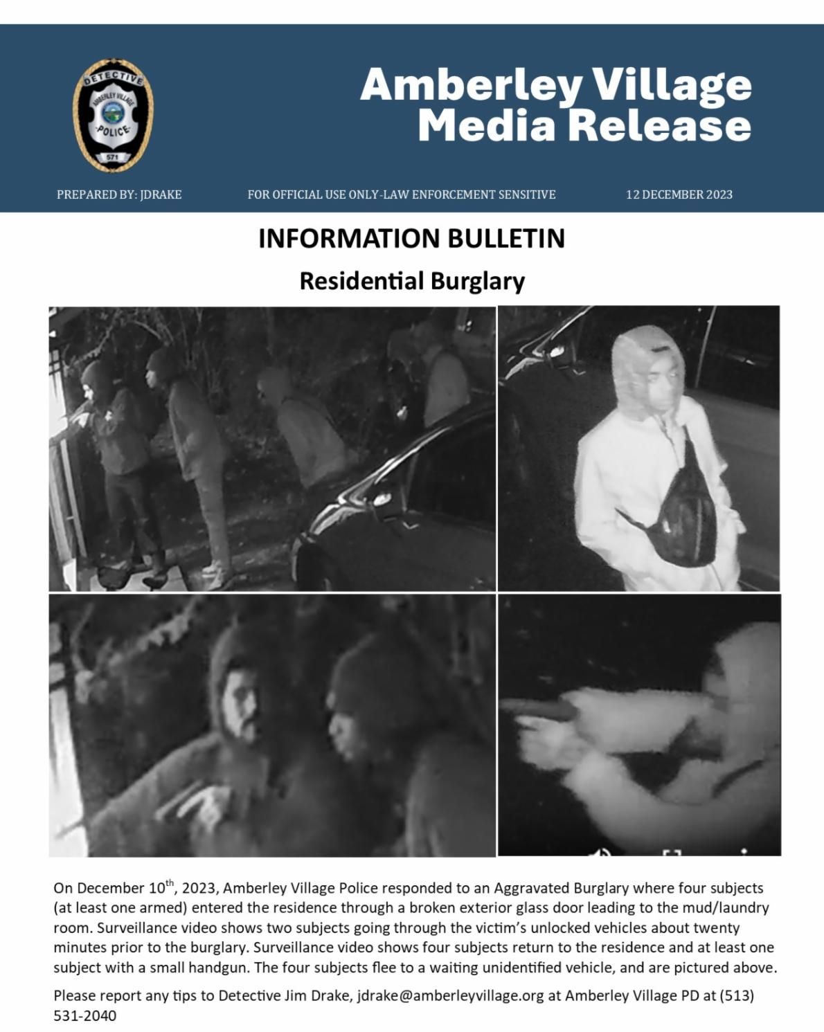 Amberley Village recently posted a Crimestoppers alert in connection with a residential burglary that occurred in December. The posting was subsequently added to Village social media outlets, and shared across neighboring communities.