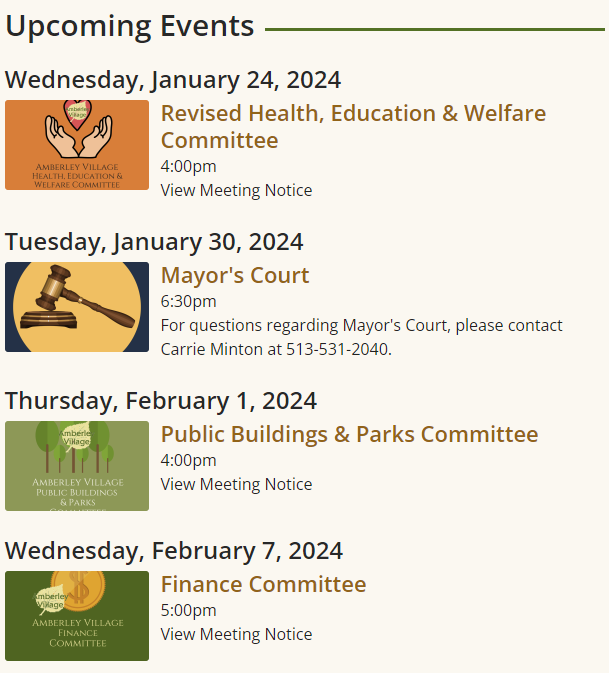 Amberley Village Council meets on the second Monday of each month (unless there is a conflict). The next meeting is scheduled for Monday, February 12, 2024 at 6:30 pm in Council Chambers at the Municipal Building, located at 7149 Ridge Road.