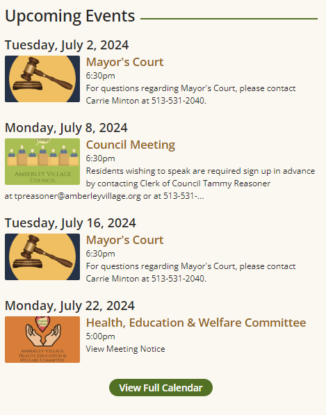 Amberley Village Council meets on the second Monday of each month (unless there is a conflict). The next meeting is scheduled for Monday, July 8, 2024 at 6:30 pm in Council Chambers at the Municipal Building, located at 7149 Ridge Road.