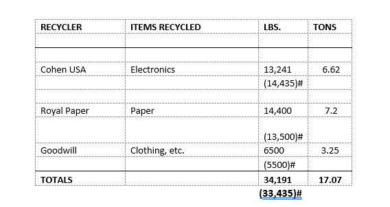 The Amberley Village One Stop Drop served more than 500 cars this year, representing almost 100 more cars than last year. The Environmental Stewardship Committee (ESC) had 20 volunteers who provided 77 hours of work for the event, which was also an increase from the 60.5 hours served last year. The chart below highlights collection results for the event: | |