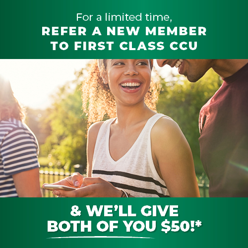 For a limited time, when you refer a new member to First Class, you'll both receive $50* cash as our thanks for helping grow your member-owned credit union.